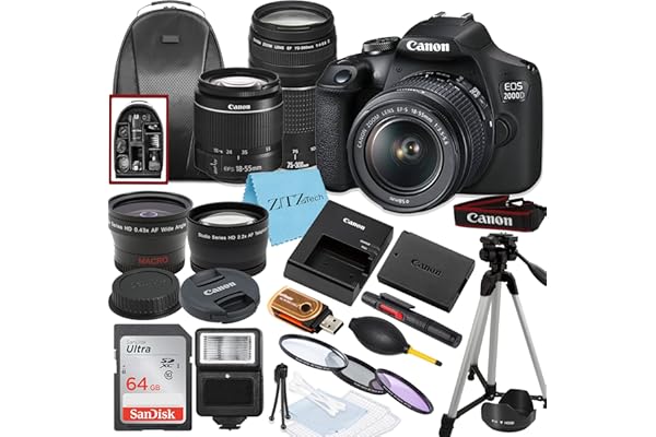 #1:(Renewed) Canon EOS 2000D / Rebel T7 DSLR Camera with EF-S 18-55mm + EF 75-300mm Daul Lens + SanDisk 64GB Memory Card + Tripod + Case + Wideangle Lenses + ZeeTech Accessory Bundle (21pc Bundle)